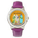 Montre-bracelet personnalisé Surfer girl avec trois tableaux de surf design. Des planches dessinées à la main dans des imprimés tropicaux amusants sur un arrière - plan orange. Choisissez n'importe quel style et couleur montre / bande.