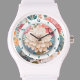 Une montre féminine très florissante aux couleurs douces. La modernité vient de la séparation des motifs dahlia en deux parties : une couronne externe et le disque interne. Entre eux se trouvent les nombres, magnifiquement écrits dans une typographie moderne semi-ouverte de travail. Un cadeau parfait pour chaque femme !