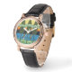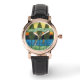 Le visage carré parfait de cette montre présente un détail peint d'une horloge en bois du Mouvement esthétique de 1896 conçue par Charles Francis Annesley Voysey, dans une belle palette de couleurs artisanales. L'image dit : "Le temps et la marée n'attendent personne."