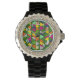 Cette montre a un design moderne du milieu du siècle de triangles superposés dans des couleurs fleuries courant verticalement sur un champ de vert.