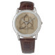 Une montre classique en cuir Brown pour hommes avec un simple triquetra celtique entrelacé d'un cercle formant un symbole trinitaire contre un arrière - plan en bois, représentant l'unité spirituelle avec le divin.