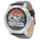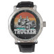 This stylish wall clock captures the essence of a truck driver's journey with a striking sunset motif. Against a black background with a teal rim, it features a semi-truck silhouette in black and white set against horizontal stripes of orange and yellow, evoking a scenic drive. The bold text "TRUCKER" proudly anchors the design. It's a perfect gift for any professional driver who appreciates the beauty of the open road. The design tool can also be used to add custom text if you want your name or company on this clock. You can customize the color of the frame to any color you desire by going into the design tool.
