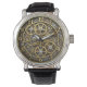 Jazz Trumpet Watch avec motif steampunk industriel avec des engrenages métalliques, des roulettes, des roues en or, argent et cuivre. Montre unique et cool pour musiciens, joueurs de jazz, joueurs de trompette et fans de musique.