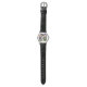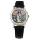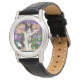 Un mignon chat bicolore noir et blanc, European Shorthair, assis sur une chaise en bois devant des fleurs de jardin violet. Photo Katho Menden. Cette montre est une idée cadeau pour les amoureux de les chats.