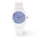 Un motif répétitif se propage à travers un arrière - plan bleu ciel sur cette montre amusante.
