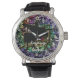 Keeping Time Drummer et Music Notes Watch. Un batteur joue un tambour sur des notes musicales psychédéliques d'arc-en-ciel avec des chiffres en or métallique clair et les mots "garder le temps". A Music Watch pour votre musicien percussionniste préféré ou amoureux de la musique.