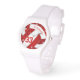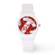Cette montre de volley-ball pour filles cool comporte des chiffres de visage à horloge blanche et un graphique de volley-ball rouge et blanc sur lequel vous pouvez customiser son nom et son numéro de maillot - les panneaux de volley-ball rouge sont mélangés avec un motif kaléidoscopique à fleurs girly - par katz_d_zynes