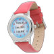 Pour customiser ce produit, téléchargez votre propre image ou photo arrière - plan comme indiqué ci-dessus. Ce modèle de montre personnalisé avec des chiffres rouges semi-transparents (30% de sheer) ajoute un bel accent de couleur à votre image ou photo arrière - plan. Les ombres-gouttes donnent aux numéros de ce garde-temps imprimé plat un aspect en relief, presque 3D. Cette conception va particulièrement bien avec les arrière - plans patriotiques. Lorsqu'il est jumelé avec un groupe rouge correspondant comme indiqué ici, il fait une montre cool pour les enfants et les adolescents.