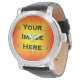 Pour customiser ce produit, téléchargez votre propre image ou photo arrière - plan comme indiqué ci-dessus. Ce modèle de montre personnalisé est une conception simple et élégante de garde-temps avec des chiffres noirs minces et surlignés qui indiquent l'heure. Les arêtes jaune vif (2px) font ressortir les chiffres par rapport à une grande variété de couleurs.