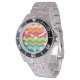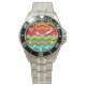 Cette montre a un design rétro des années 1970 de lignes horizontales zigzag en jaune, orange, rouge, vert et bleu sur un champ de brun.
