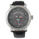 Une montre macabre avec un cool qui a l'air zombie, portant des vêtements déchirés et en lambeaux avec les bras tendus à la recherche de marques. De grands yeux vides avec une peau pourrie et écossaise. Le sang éclate derrière sa tête. Texte dit zombie hunter, en lettres courbes et est également personnalisable si vous voulez changer ce qu'il dit. Placez-vous sur un arrière - plan gris charbon.
