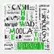 Montrez-moi L'argent est un design graphique, un nuage de mots textuels seulement. Les polices décoratives vertes et noires épellent le mot argent et beaucoup de synonymes pour le mot argent. Le texte vert dit : MONTRE-MOI L'ARGENT. Un jeu amusant sur les mots, par exemple : cash, dinero, wad, bucks, greenbacks, cheddar, chou, pesos, pâte, etc.