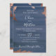 Lavage à l'aquarelle moderne en bleu marine moody avec des accents faux métalliques en feuilles de cuivre, faire-part de mariage. Personnaliser texte, style de police, couleur et taille.
