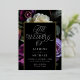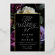 Élégante invitation à mariage floral moody avec un arrière - plan de fleurs violettes, ivoire et bordeaux avec feuillage vert luxuriant sur un arrière - plan noir. "Le Mariage de" est présenté dans une typographie élégante et moderne. Personnalisez le mariage floral violet invite avec vos noms et détails mariages situés à l'intérieur d'un cadre rectangle de feuille d'or. Le design s'harmonise avec notre collection Moody Gothic Floral mariage.