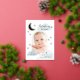 Un design ludique et élégant qui vous propose une photo en forme d'arc moderne, associée à des polices élégantes, des étoiles dessinées à la main, des nuages et une lune en croissant. L'arrière comporte un collage photo de 3 étoiles et plus. N'oubliez pas de visiter la collection pour en savoir plus.