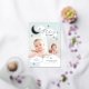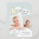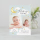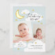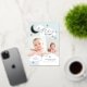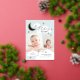 Un design de faire-part de naissance amusant et élégant avec un collage photo 2 avec script de calligraphie élégant et des étoiles dessinées à la main, des nuages et une lune croissant. La lune et les étoiles sont dans un vrai papier d'aluminium. Toutes les couleurs sont modifiables à l'aide des outils d'édition.
