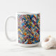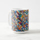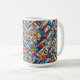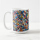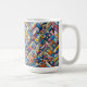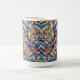 L'image est une mosaïque colorée avec un motif complexe de formes et de lignes tourbillonnantes. Le design comprend une variété de couleurs comme le bleu, le vert, le jaune, l'orange et le rouge, créant un effet visuel dynamique et dynamique. Les pièces en mosaïque sont disposées de manière à former un motif fluide, presque fleuri, aux éléments circulaires et en spirale. L'oeuvre est visuellement captivante en raison de sa complexité et de l'harmonieux mélange des couleurs.