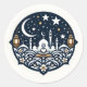 Cette illustration présente l'illustration d'une mosquée, d'un ciel nocturne avec une lune et des étoiles, de lanternes et d'un homme en prière. Profitez de votre nouveau Sticker rond classique Mosquée et Homme en Prière!
