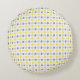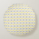 Coussin ronde décorative avec motif jaune et gris.
