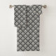 Un ensemble de serviettes et un gant de toilette présentent un motif damassé floral blanc classique sur un fond gris foncé. Les accessoires de salle de bain dégagent une atmosphère sophistiquée et élégante.