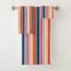 Design coloré et élégant, avec des tons orange, bleu, rose dans un motif à rayures mêlant couleurs vives et pastel ; un design moderne et lumineux pour une salle de bain/douche