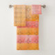 Ensemble De Serviettes De Bain Motif Boho Sunrise. Alternant des carreaux de couleur vive rose et orange avec une superposition rustique motif en bronze pour rehausser votre décor de salle de bains. Les serviettes sont un accessoire amusant et élégant pour compléter votre palette de couleurs et le style de la salle de bains principale, des chambres ou des salles de bains principales. Je serais heureux de redimensionner, de teindre ou de concevoir avec vous en tête, juste un message pour me lancer.