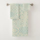 Épais et velouté, le kit de serviettes est composé d'un classique motif de tuiles d'oignon marocain dans des tons chauds et terrestres de Glacier Blue (un ombrage d'aqua clair cool) contre un arrière - plan couleur crème. Sans distinction de genre, ce design magnifiquement riche a souvent été un favori dans les maisons victoriennes (& châteaux!) mais se fond avec presque n'importe quel style de décoration.