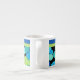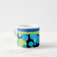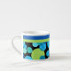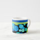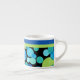Un café Espresso Mug avec un motif de lunes bleues et vertes sur un arrière - plan noir, d'un collage de papier peint à la main par Judy Adamson.