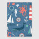 Cette conception surprenante présente un thème nautique avec des tonnes de vie marine, phares, baleines, ancres et amandes ; drapeaux nautiques sur un arrière - plan bleu foncé.