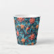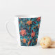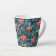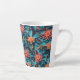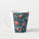Une belle tasse en latte avec un motif floral en papier transparent contre un arrière - plan bleu.
