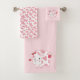 Ce joli ensemble de serviettes de bain dispose d'une vache de style kawaii en rose, avec une queue de fraise et un arc. Un papillon à thème de fraise flotte à proximité. Vous pouvez personnaliser les éléments en ajoutant du texte, si vous le souhaitez. La serviette à main est munie d'un motif assorti aux taches de vache. Parfait pour les amateurs de pastel, d'esthétique et de fraise !