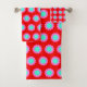 Cet ensemble de serviettes de bain dynamique et ludique dispose d'un motif amusant des fleurs pop boho du mod 60s rose et turquoise sur un arrière - plan rouge.