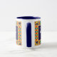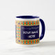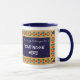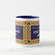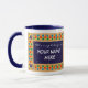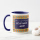 Mug à anneau blanc avec une jante et une poignée bleu foncé. La conception de la frontière est de Motif islamique peint à la main d'étoiles et de lunes dans des couleurs vives, dessiné avec de la gouache d'or. Il y a un panneau, avant et arrière en bleu foncé avec du texte blanc, prêt pour vous à personnaliser avec le nom de votre choix.