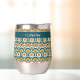 Ce verre à vin est de style bohème coloré, motif de cercles bleus, oranges et jaunes superposés. Votre nom, monogramme ou autre texte est en jaune pâle sur une bordure turquoise bleue. Style rétro !