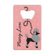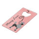 Cette conception française mignonne d'ouvreur de bouteille de crédit-carte de caniche est dérivée des jupes classiques de caniche des années 1950. Le chien de caniche assez noir a les pompons gris de la fourrure avec le pois et une laisse noire de pochoir-style. Il tous les repos sur un arrière - plan rose vintage avec un effet polka-pointillé rose-clair.