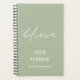 Motivational Believe Script 2024 Nom Sage Green. Gardez-vous organisé pour l'année à venir avec ce design inspirant avec un mot encourageant, Croyez, dans un script informel en blanc sur un arrière - plan vert sage. Personnalisez avec l'année et votre nom. Un sauge correspondant est sur le dos.