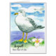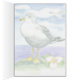 Carte de voeux ornée d'une mouette à bec cerclé sur la rive gazonnée d'un lac avec un accent de fleur Sego Lily inspiré de l'Oiseau d'Etat et de la Fleur d'Etat de l'Utah illustrée de stylo et d'encre et peinte d'aquarelle.