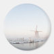 Aimant photo souvenir rond avec un moulin à vent dans la neige à côté d'un canal pendant un lever de soleil brumeux en hiver dans la Pays-Bas