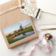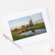 Colonne photo souvenir rectangulaire d'un moulin à vent à côté d'un petit fossé avec un pont au bord d'une grande prairie dans la campagne hollandaise au coucher du soleil à Aarlanderveen, la Pays-Bas.
