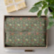 Papier de tissus avec motif adorable, fournitures à coudre - ciseaux, boutons, bobines de fil, aiguilles - dispersé sur arrière - plan vert bouteille. Cette conception, élaborée à partir d'un collage en papier fait main, fait un grand cadeau pour les artisans et les égouts.