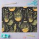 Ce papier de tissu peut être utilisé pour le découpage ou l'emballage cadeau. Il a un design tout en plante, et des terrariums en verre en forme de jarre et de bouteille avec des plantes dorés, jaunes et verts et des botaniques sur un arrière - plan noir. Nous aimons cette impression pour un style esthétique cottagecore ou boho.