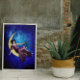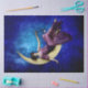 Sur une photo vintage fantaisiste, une femme s'assoit gracieusement sur la lune du croissant, entourée de la douce lueur des étoiles lointaines. Elle porte une robe élégante qui coule autour d'elle, et ses yeux brillent d'émerveillement. Dans sa main, elle tient délicatement une lanterne en forme d'étoile, sa lumière douce jetant une aura de rêve. La scène capte un sentiment d'enchantement comme si la lune elle-même était une perche magique pour une muse céleste.