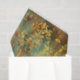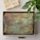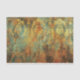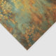 C'est un motif décoratif orné dans les tons or, turquoise et rouille. Le design présente des motifs complexes et symétriques de damas ou d'arabesques qui ressemblent à des feuilles d'acanthus stylisés, des rouleaux et des éléments floraux disposés en colonnes verticales. Les motifs ont un aspect triste, patiné avec des zones défraîchies et usées, révélant turquoise et rouille sous la couche dorée. Cet effet de patine vieilli donne au design une atmosphère antique ou vintage.