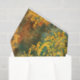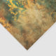 C'est un motif décoratif orné dans les tons or, turquoise et rouille. Le design présente des motifs complexes et symétriques de damas ou d'arabesques qui ressemblent à des feuilles d'acanthus stylisés, des rouleaux et des éléments floraux disposés en colonnes verticales. Les motifs ont un aspect triste, patiné avec des zones défraîchies et usées, révélant turquoise et rouille sous la couche dorée. Cet effet de patine vieilli donne au design une atmosphère antique ou vintage.