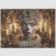 Une harlequine captivante et énigmatique, regardant en avant avec des yeux brillants et hypnotiques qui semblent percer à travers le voile de la réalité. Son visage en porcelaine est orné de marquages arlequins classiques mais surréalistes : motifs de diamant tranchants, peinture théâtrale en effigie, ou motifs délicats en fibre qui brillent dans la lumière. Ses lèvres sont peintes dans une teinte profonde et dramatique, légèrement écartées comme si elle détenait un secret indicible.