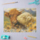 Vaches Highland dans un champ de tournesols avec une vue montagneuse dans l'arrière - plan. Photo originale de Jennifer Carroll