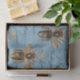 Les grandes abeilles au miel sont devant un beau arrière - plan bleu vintage avec écriture. Parfait pour les objets artisanaux en découpage ou les cadeaux. Assurez-vous de retirer le sac cadeau correspondant!
