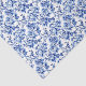 Ce papier tissulaire présente un design floral bleu et blanc.