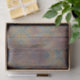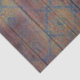 Design de papier de soie vintage avec motif damassé or et rouge en détresse sur fond en bois.