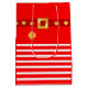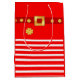Sac cadeau rayé rouge et blanc orné de trèfle doré.